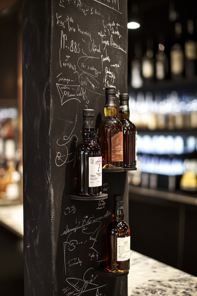 Picture clear glass bottles wrapped in matte black chalkboard paint, with handwritten labels in chalk. The labels feature fun messages or cocktail ingredients, which guests can read easily. Soft lighting highlights the matte finish, giving a sophisticated yet playful vibe. The contrast between the dark bottles and white chalk creates a clean, customizable look that can be changed as needed.