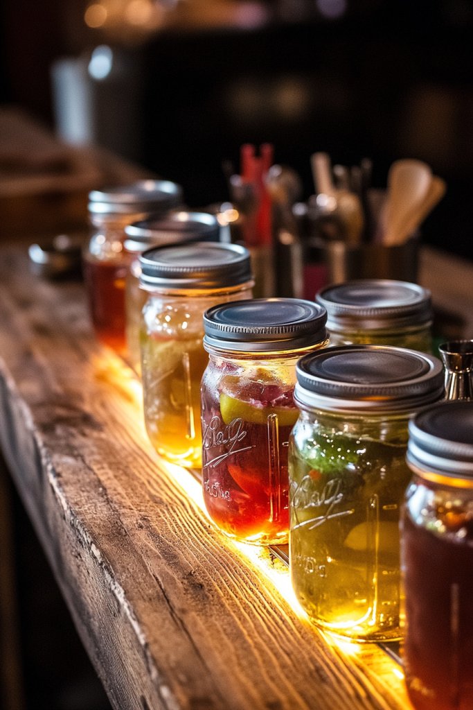 Imagine rows of glass mason jars filled with colorful liquids, herbs, and garnishes, all illuminated by soft LED fairy lights. The jars sit on open shelves or a sturdy wooden tray, creating a warm, inviting glow. The textured glass and twine or metal accents add a touch of vintage vibe. The ambient light reflects off the jars, making the whole setup feel lively yet intimate.