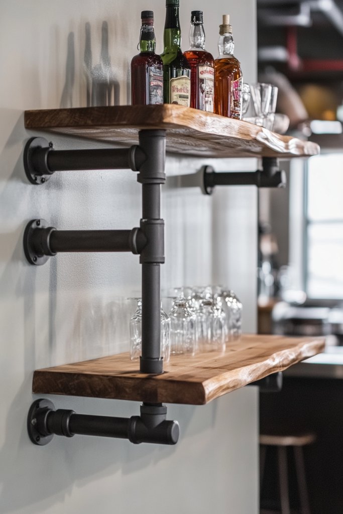 Start by measuring the desired length and securing wall anchors for the pipe fittings. Assemble the pipes using threaded connections, then attach the wood shelves with brackets or screws designed for wood and metal. Sand and finish the wood as needed, sealing it with a protective coat. Mount the whole structure securely, ensuring it can hold your bar essentials. Organize bottles and glasses on the shelf, keeping everything within easy reach. This project combines DIY simplicity with high-end style.