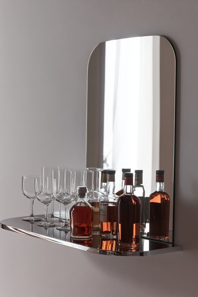 Imagine a minimalist floating shelf mounted on the wall, with a mirrored panel behind it that doubles the visual space. Bottles and glasses sit on the ledge, while the mirror reflects ambient lighting, adding depth and brightness. The mirror’s frame could be sleek metal or painted wood, depending on your aesthetic. Soft, indirect lighting from hidden LED strips enhances the reflective surface, creating a luxurious ambiance.