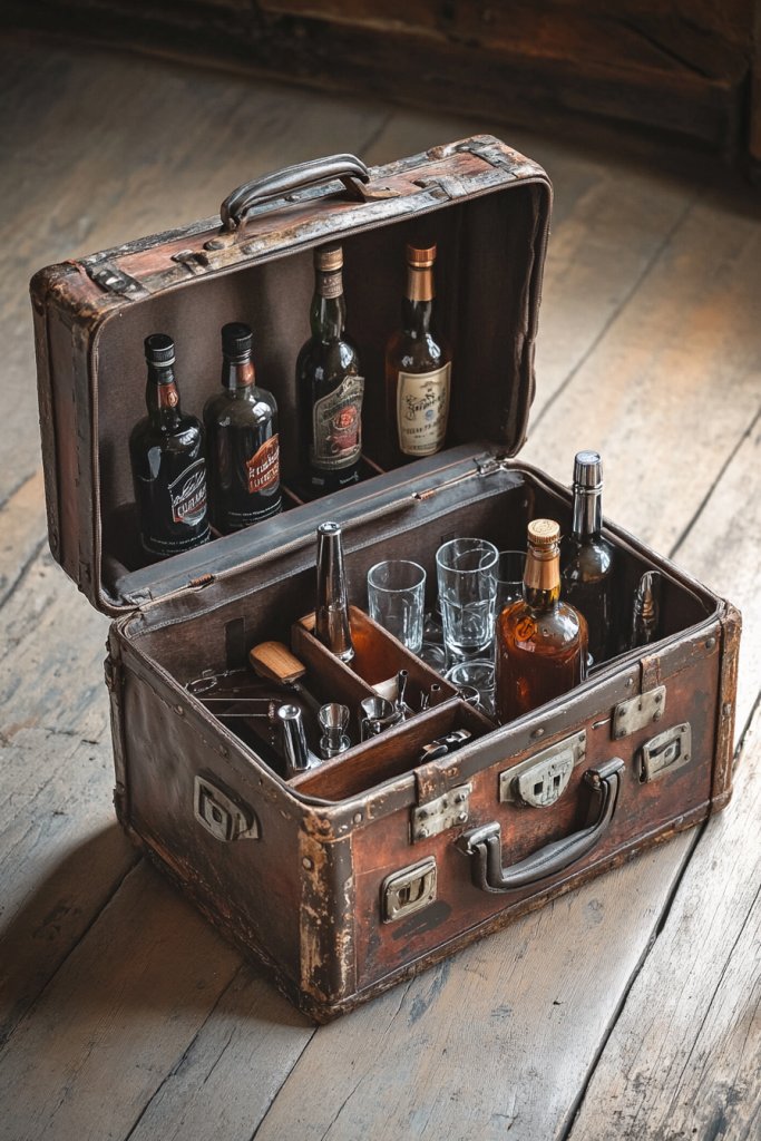 Visualize an old leather or fabric suitcase, opened to reveal compartments filled with bottles, glasses, and bar tools. The interior can be lined with fabric or cork for a refined look. The exterior retains its vintage charm, with worn edges and brass hardware. When closed, it becomes a portable, stylish piece that fits in easily anywhere, from a shelf to a picnic table.