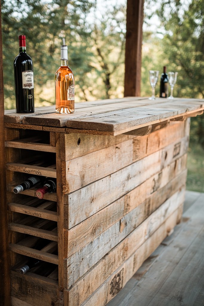 Picture a sturdy rectangular frame made from reclaimed pallet wood, with a cozy, weathered finish. The lower section houses a custom wine rack, while the top serves as a bar surface. The natural wood grain and rough texture add warmth, making it perfect for a country or industrial aesthetic. Bottles are stored horizontally in the rack, while glasses and accessories sit on the surface.