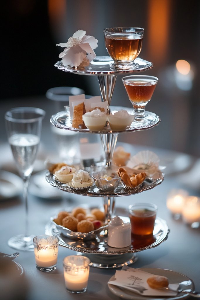 Imagine a three-tiered stand made from vintage china or modern metallic trays, stacked with small glasses, cocktail garnishes, and bite-sized appetizers. The varying heights create a dynamic display that draws the eye and encourages mingling. Soft lighting or candles placed around the stand amplify the layered effect, making it a centerpiece. The combination of textures and colors can match any theme, from rustic to glam.