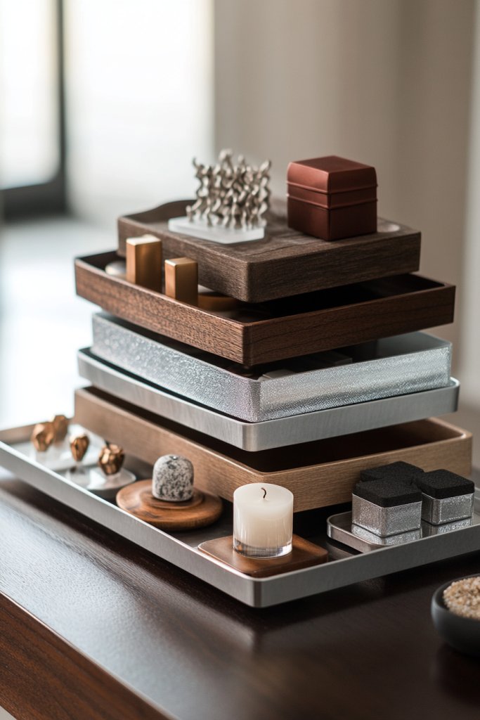Imagine a set of nested trays, each with a different texture—metal, wood, or acrylic—and varying heights. They hold small decor items like candles, boxes, or sculptures, creating a vertical hierarchy. The layers draw the eye upward and make the space feel more curated and intentional. The contrast in materials adds richness and depth.