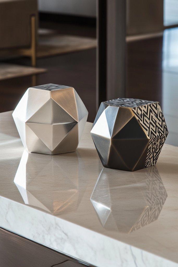Picture a set of metal or acrylic sculptures with clean lines and angular shapes. Placed on a console or shelf, they create a striking focal point. Complement with geometric trays, bowls, or picture frames to reinforce the theme. The sharp lines and symmetry bring a fresh, modern energy to the space.