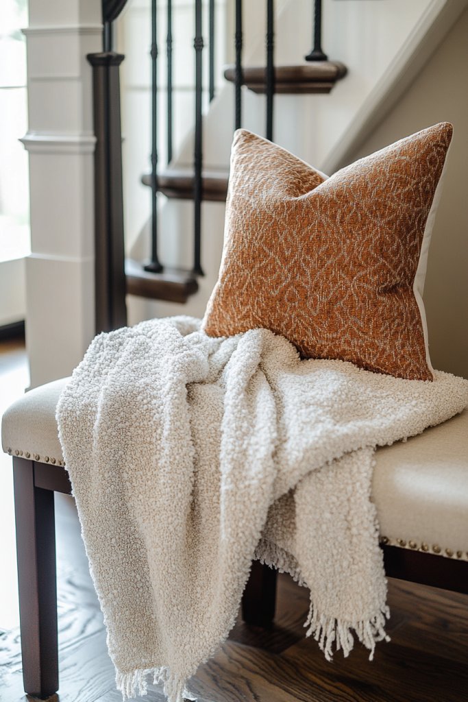 Imagine a small cushioned bench topped with a soft cream throw blanket and a couple of decorative pillows—perhaps in plush velvet or chunky knit. The textures invite touch, making the space feel welcoming. Add a patterned or colorful pillow to introduce personality and contrast. The overall look is cozy, stylish, and perfectly lived-in.