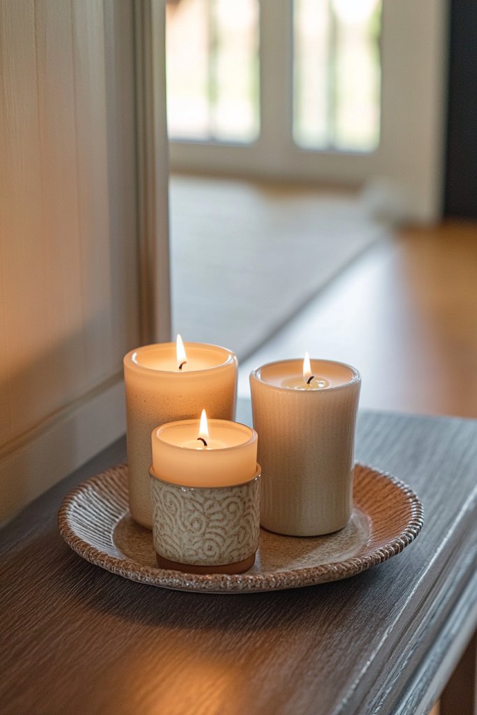 Use pillar candles, tea lights, or taper candles depending on your space and style. For a minimalist look, opt for sleek, monochrome holders and simple candles. During festive seasons, incorporate themed holders or add seasonal accents like mini pinecones or faux berries. For small entryways, group a few small candles in different holders for a clutter-free look. For larger spaces, a tall statement candle paired with smaller ones creates balance.