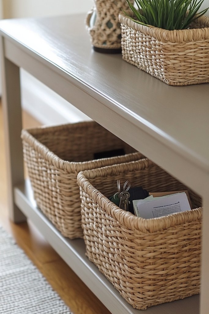 Envision woven rattan or plush fabric baskets sitting neatly under a console table or beside the door. They hold everything from shoes and umbrellas to mail and scarves, keeping the surface clear. The baskets’ textures—natural fibers or soft textiles—bring coziness and visual interest. A few baskets with contrasting colors or patterns create an inviting layered look.