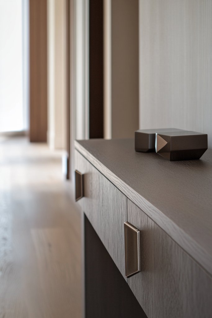 Imagine a slim, streamlined console in matte black or light wood, with eye-catching drawer pulls or knobs in brushed brass or matte black. The surface remains uncluttered, offering space for small decorative objects or functional items. The hardware becomes the focal point, drawing attention and adding sophistication. The overall look feels modern, clean, and effortlessly elegant.