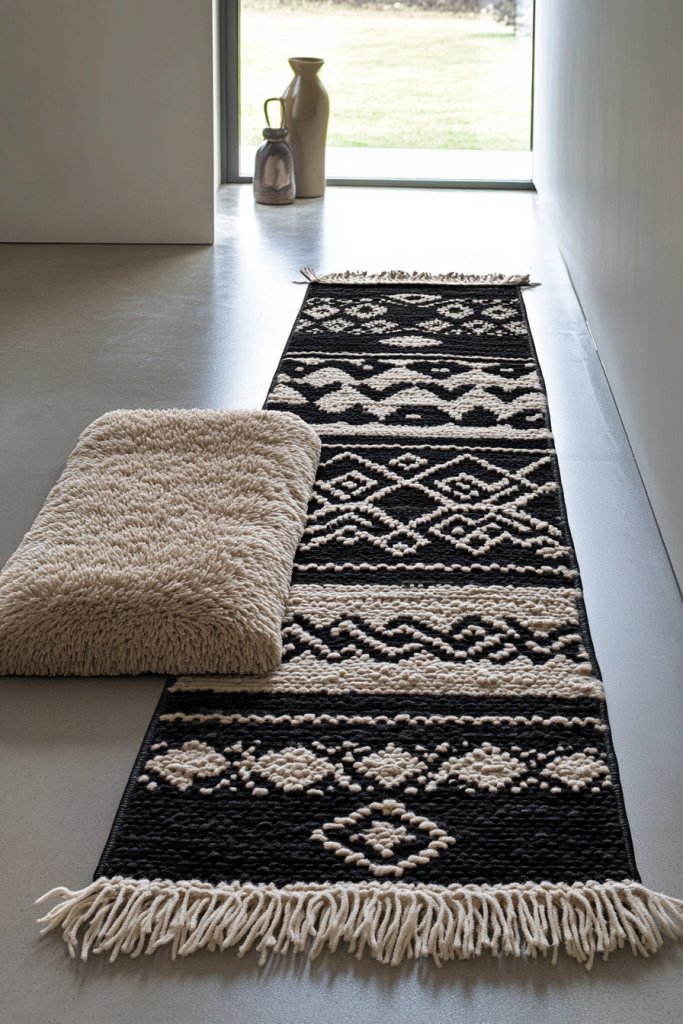 Imagine a patterned woven runner with bold geometric designs or intricate motifs, adding depth and character. The textures—knit, braid, or looped pile—invite touch and create visual layers. Soft, plush mats in neutral tones can soften the space, while textured weaves add a lively vibe. The runner’s design can define the space, guiding visitors inward.