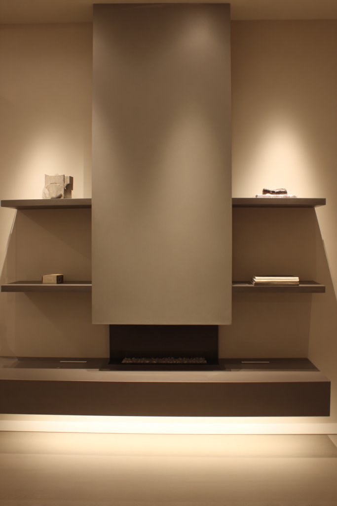Visualize a smooth or textured concrete wall serving as a backdrop for your fireplace. The cool gray tones and matte surface give a sleek, no-fuss appearance. When your fire is lit, the flickering flames contrast beautifully against the industrial surface, creating a striking visual. Metal accents or exposed piping can enhance the exposed, raw feel, making the space feel like a modern art installation.