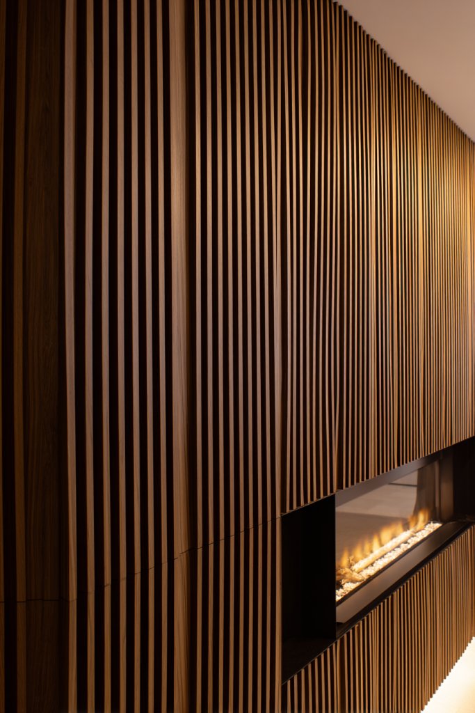 Picture vertical or horizontal wooden slats arranged in a layered, overlapping pattern across your wall. The natural wood tones, combined with the shadow play from layered depths, add richness and texture. The fireplace is concealed behind a clean, minimalist panel that opens or slides away when needed. When lit, the flickering flames peek through the gaps, creating a cozy glow.