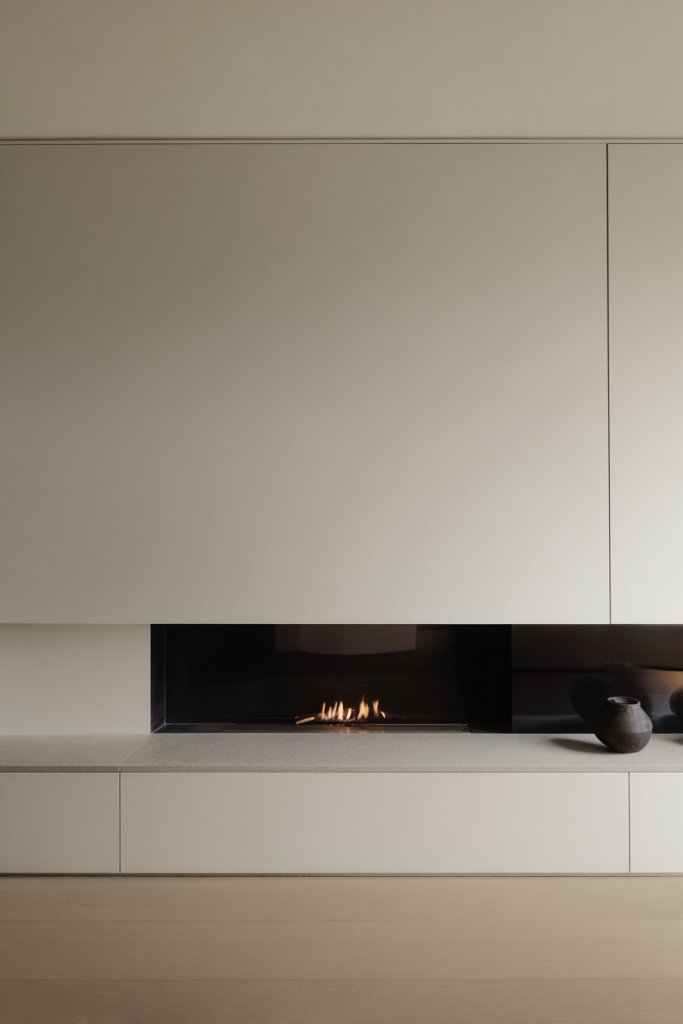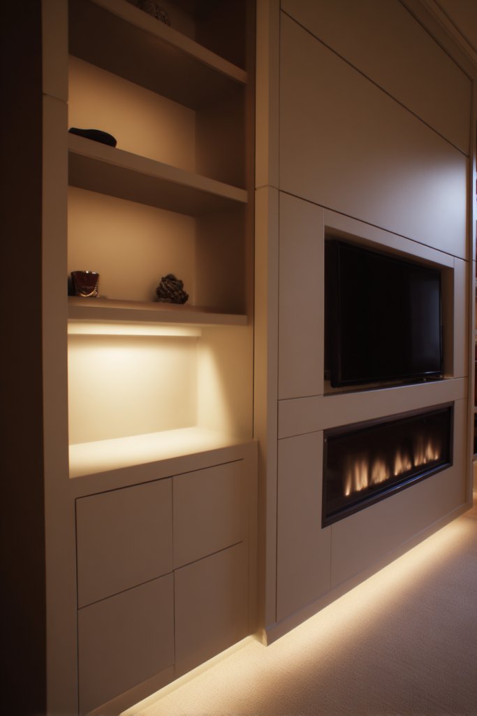 Imagine a seamless wall where the fireplace is flush-mounted within a custom cabinetry unit. Hidden compartments and drawers conceal media devices, remotes, or other clutter, maintaining a tidy look. Soft LED lighting runs along the edges or beneath shelves, casting a gentle glow that highlights the fireplace and adds warmth to the room. The result is a clutter-free, cozy, and elegant space.