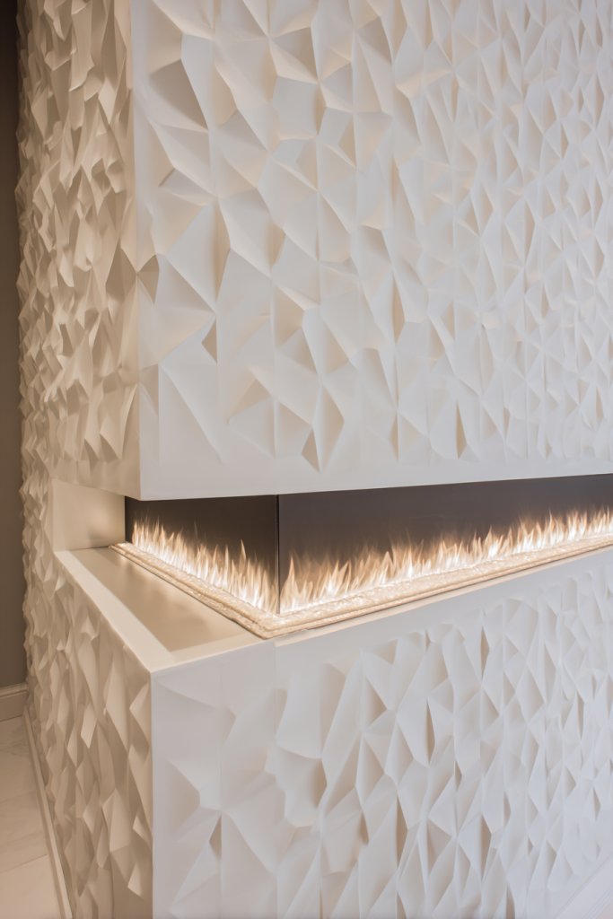 Imagine 3D wall panels with geometric or organic patterns, painted in neutral tones or bold colors, framing your electric fireplace. The textured surface catches light at different angles, creating shadows and depth. When the fireplace is lit, the flickering flames dance across the textured backdrop, making the wall feel alive and dynamic. The overall effect is modern elegance with a tactile edge.