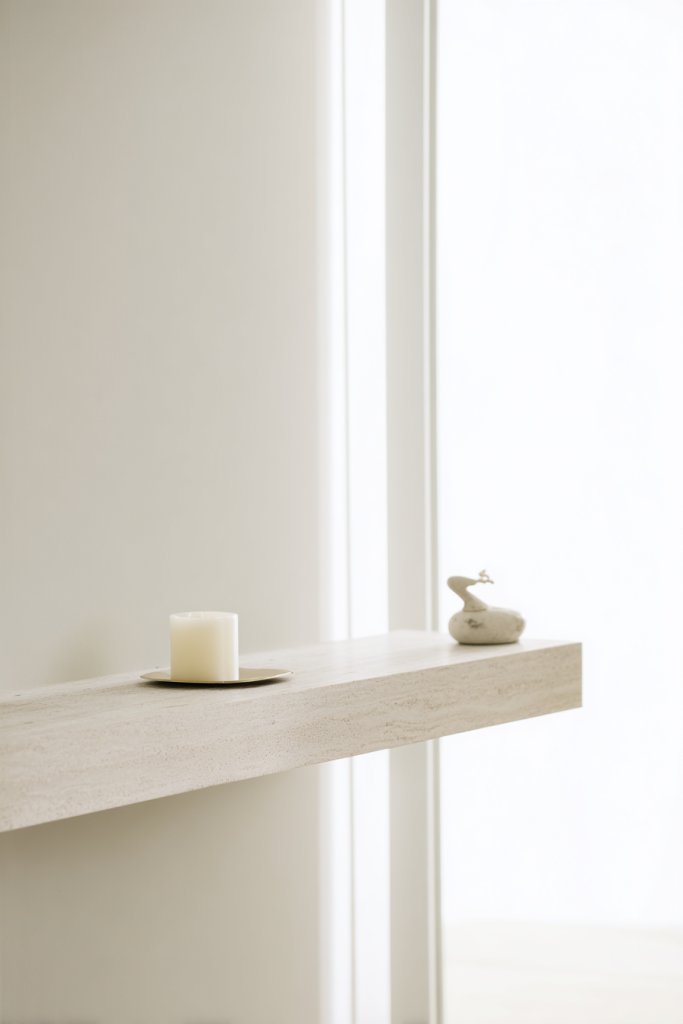 Imagine a slim, floating shelf made of wood or stone, mounted just above your fireplace opening. The clean lines create a minimalist aesthetic, while the shelf itself offers a versatile surface. Decorate with candles, sculptures, or small decorative objects—nothing bulky—that enhance without cluttering. The floating design emphasizes simplicity and lightness, making your fireplace area feel airy and sophisticated.
