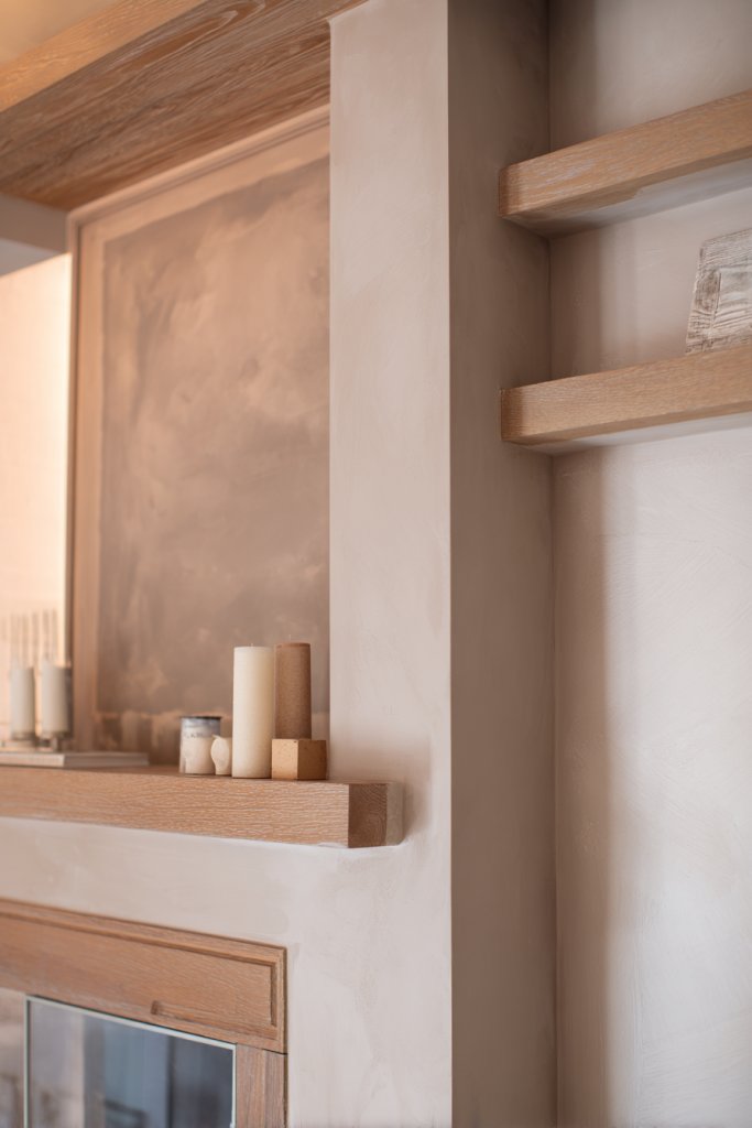 Picture walls painted in soft beiges, taupes, or greys, complemented by natural wooden trims or panels. The layered textures and tones add depth without overwhelming the senses. The fireplace acts as a warm focal point, surrounded by wooden mantels, shelving, or accents that enhance the softness. The overall vibe is calm, inviting, and effortlessly stylish.