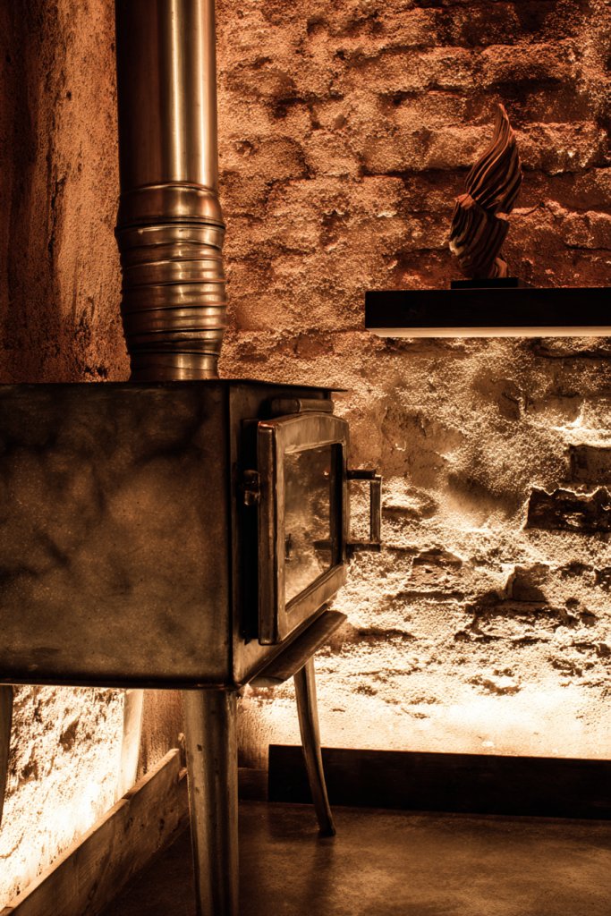 20. Industrial Metal Fireplace with Exposed Brick Wall