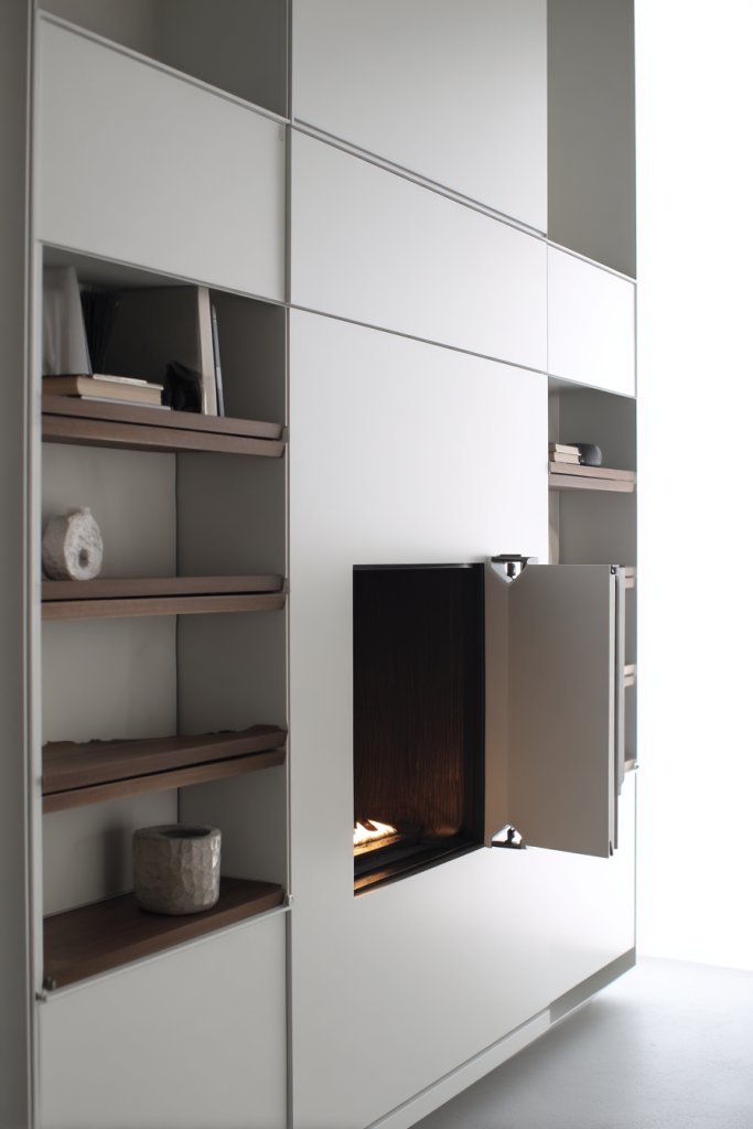 Limited space but still want the cozy appeal of a fireplace? A fold-down fireplace integrated into a multi-functional wall unit offers a clever solution. It combines entertainment, storage, and warmth in one sleek package. Who says you can’t have it all?