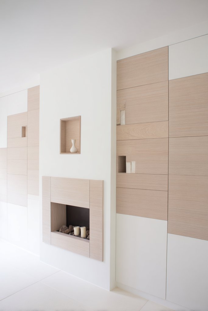 Picture a crisp white wall accented with pale, natural wood panels or trim. The light wood adds warmth and texture, while the white backdrop keeps the space feeling open and clean. The fireplace blends seamlessly into the wall, perhaps with a simple surround or mantel in matching wood. The overall look is calming, inviting, and effortlessly stylish—a true Scandinavian retreat.