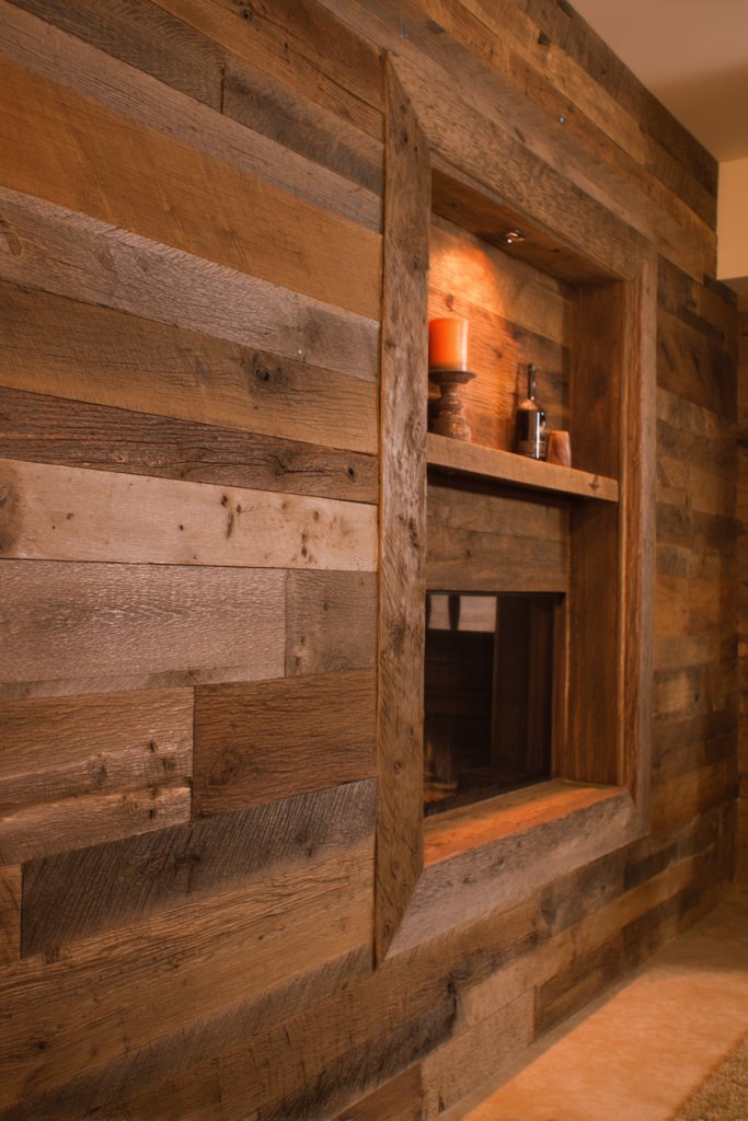 3. Reclaimed Wood Paneling with Fireplace Niche