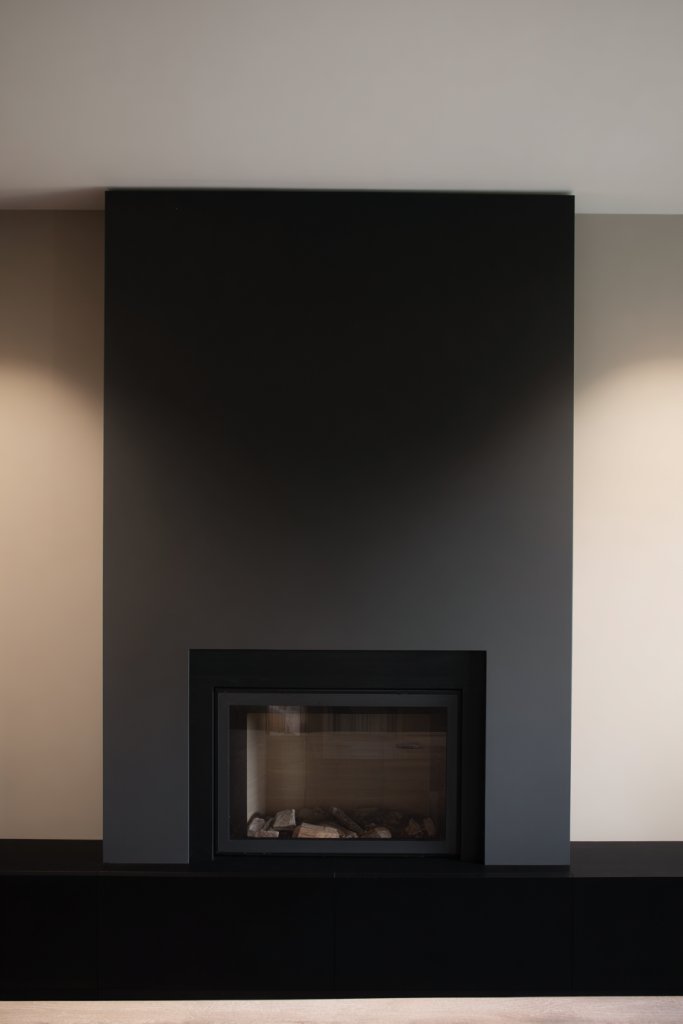 4. Black Matte Fireplace Frame with Contrasting Wall Color