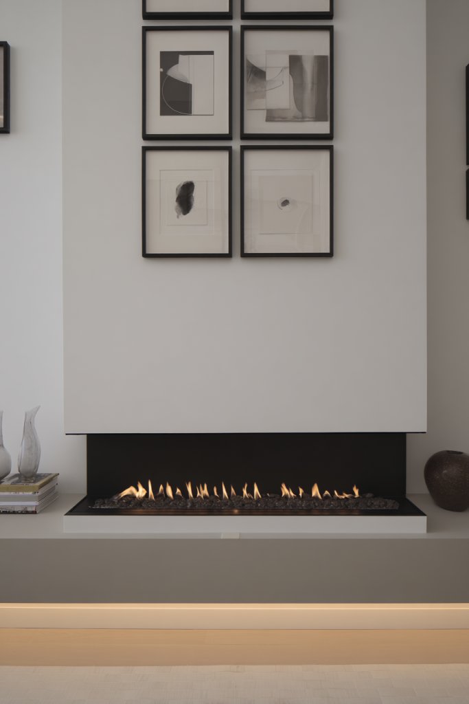 Select a slim, wall-mounted electric fireplace with realistic flame effects and adjustable heat settings. Find a wall that is structurally sound and easy to access for power supply. Install the fireplace following manufacturer instructions, ensuring proper clearance and safety measures. Frame the unit with a simple surround or leave it minimal for a cleaner aesthetic. Hang your artwork using secure hooks or wire, arranging them to balance the visual weight around the fireplace.