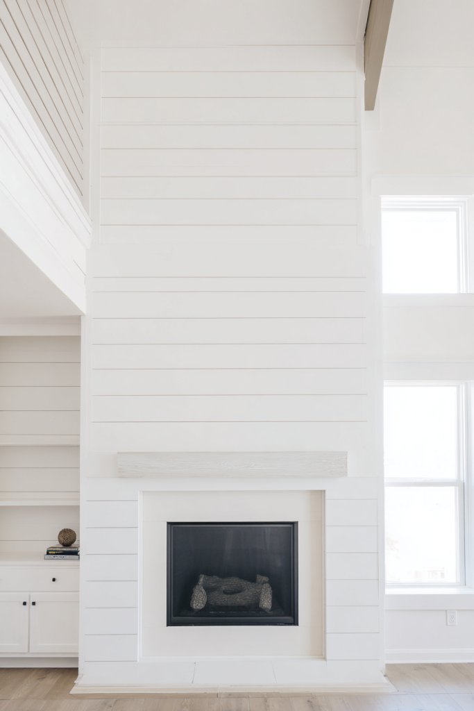 Visualize horizontal white shiplap planks covering your wall, with a recessed niche perfectly framing your fireplace. The textured surface adds depth and character, while the bright white color keeps the space feeling open and airy. The fireplace glows softly, contrasting against the crisp backdrop. This simple yet effective design creates a cozy, cottage-like atmosphere.