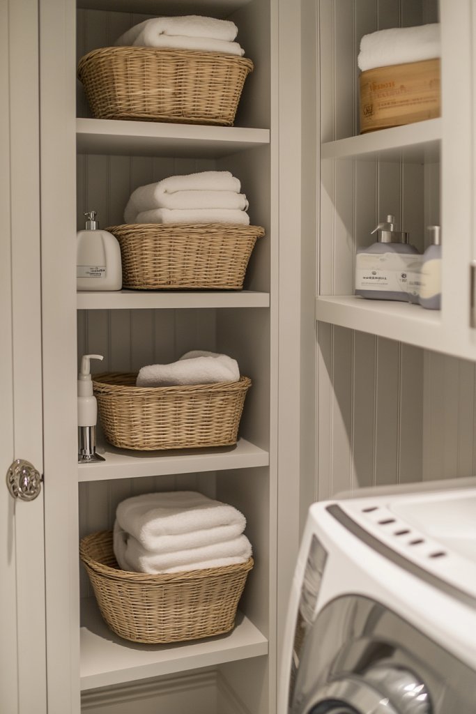 This idea works well in both minimalist white and bold color schemes, depending on your style. For a more rustic look, opt for distressed wood cabinets paired with vintage-style hardware. In a contemporary setting, sleek matte finishes and hidden compartments maximize clean lines. You can also adapt the height of the storage based on ceiling height or add a fold-down drying rack for seasonal needs.