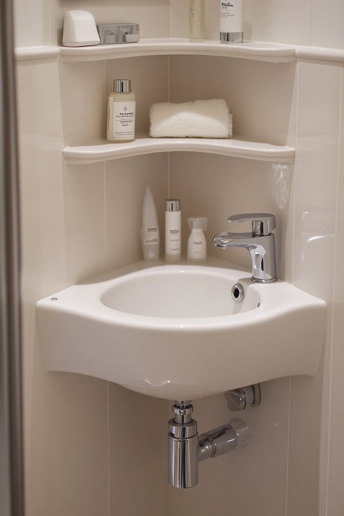 Imagine a compact, angular sink snugly fitting into the corner, with a textured countertop and a sleek faucet. Above, corner-mounted shelves hold neatly folded towels, detergents, and cleaning supplies—everything within easy reach. The sink’s simple lines contrast with the textured wall tiles, creating visual interest. The overall effect is a tidy, inviting nook that serves multiple purposes.