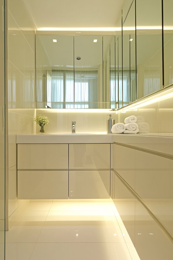 Choose light shades for walls, ceilings, and large surfaces. Use reflective or high-gloss finishes on tiles and fixtures. Install large mirrors strategically to bounce light and create visual depth. Keep clutter minimal to prevent visual overload. Use layered lighting—overhead, task, and accent—to enhance brightness and openness. Regularly clean reflective surfaces to maintain their luminous effect.