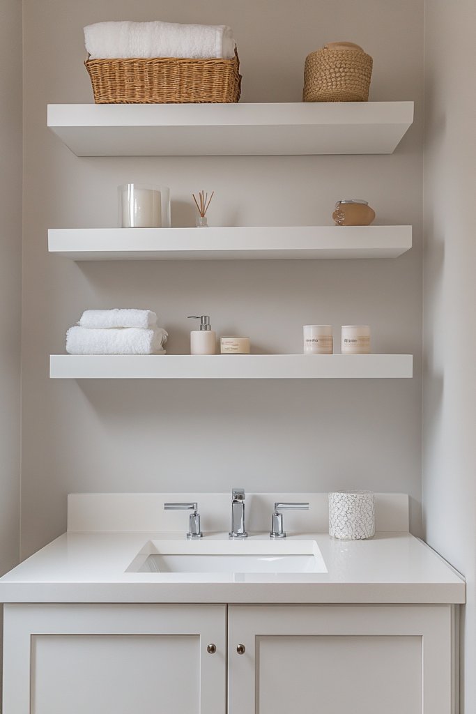 Imagine thin, floating shelves in matte black or natural wood, positioned above the sink or along open walls. Mirror cabinets with hidden hinges reflect light and expand the room visually. Small baskets or containers sit neatly on shelves, holding toiletries or cleaning supplies. The overall effect is a clean, modern look that feels open and uncluttered.