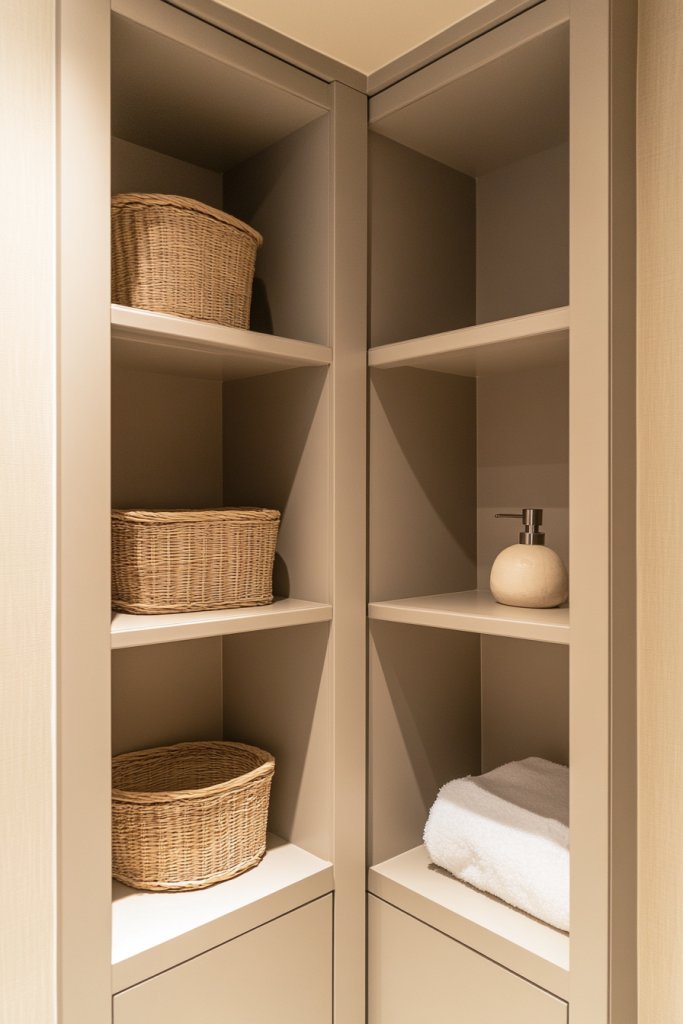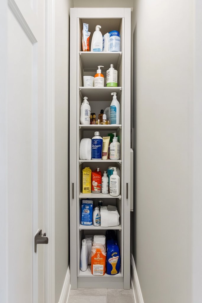 Imagine sleek, slim cabinets painted in a soft neutral tone that blend into the wall. The doors are handleless for a sleek look, with soft-close hinges that glide shut silently. Inside, adjustable shelves hold everything from towels to cleaning supplies. The high gloss or matte finish reflects light, making the space feel larger and brighter.
