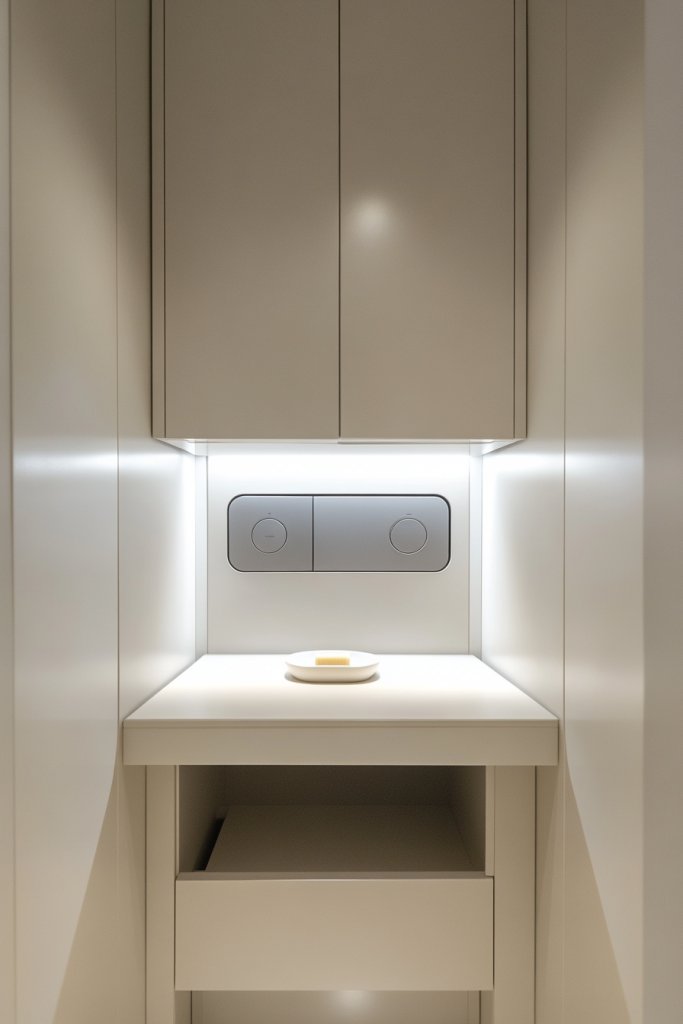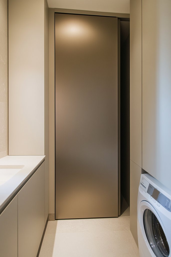 Visualize custom cabinetry with push-to-open doors that hide the washing machine and dryer seamlessly. The surfaces are smooth and handleless, with integrated lighting that highlights the clean lines. Concealed drawers store toiletries, cleaning supplies, and laundry essentials, keeping everything out of sight but easily accessible. The neutral color palette and matte finishes add to the understated elegance.