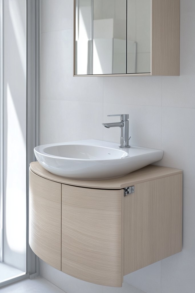 Choose sleek ceramic or composite sinks in neutral tones for a timeless look. For the fold-down vanity, opt for a durable, moisture-resistant surface that can handle daily use. Incorporate a mirrored cabinet above the sink for extra storage without taking up space. Seasonal styling can involve changing the color of the wall or adding textured wallcoverings that complement the fixtures.