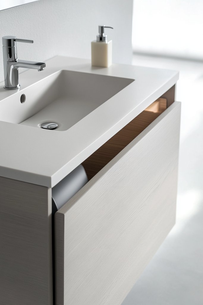 Envision a modern vanity with clean lines and a matte finish, featuring built-in compartments that conceal laundry hampers behind elegant cabinet doors. When closed, it appears as a seamless piece of furniture; when open, you access spacious drawers and hidden hampers. The countertop is clutter-free, with a minimalistic faucet and a textured backsplash that adds visual interest without overwhelming the space. Underneath, a subtle gap allows air circulation, preventing odors.
