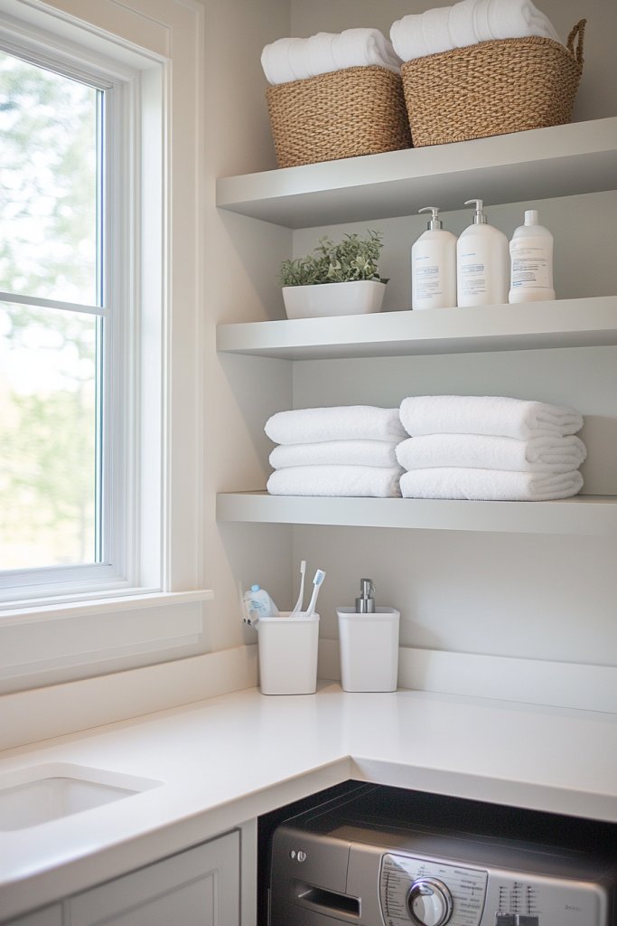 Visualize a simple countertop fitted beneath a large window, with a compact washer tucked underneath. Open shelves above hold baskets, detergents, and cleaning tools—everything within arm’s reach. The window floods the space with natural light, making even a small laundry station feel airy and inviting. A textured tile backsplash adds visual interest while protecting the wall from splashes.