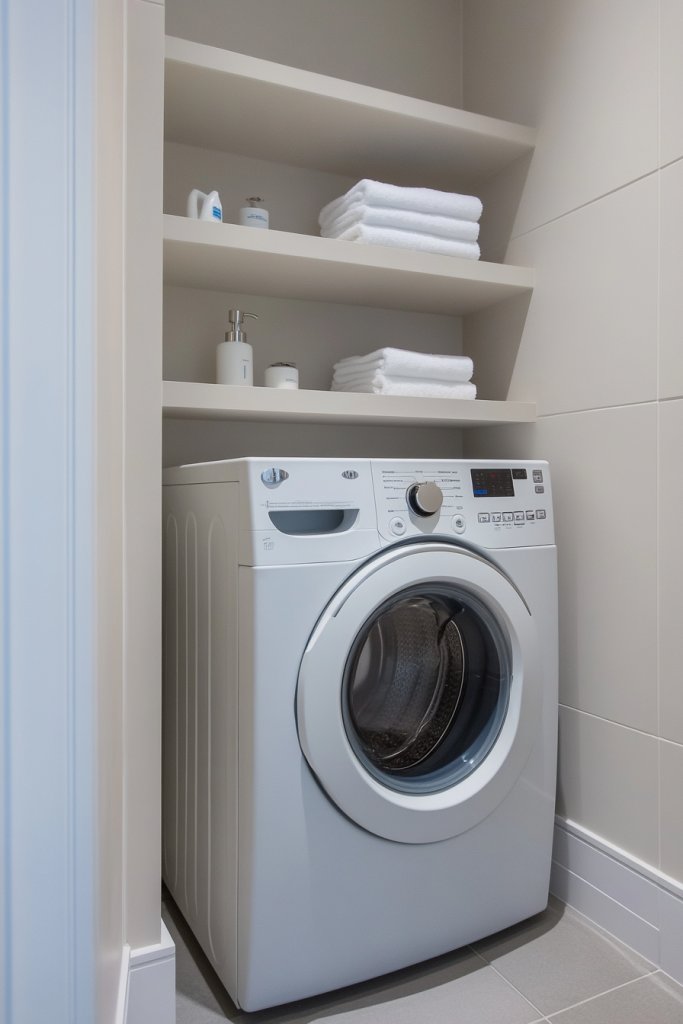 Picture sleek, vertically stacked appliances in a dedicated corner, with slim, wall-mounted shelves running alongside. The shelves hold neatly labeled bottles, fabric softeners, and cleaning tools—everything easy to grab. The appliances’ modern design complements the minimalistic decor, with a neutral color palette that reflects light. A small, textured rug grounds the space, making it cozy yet functional.