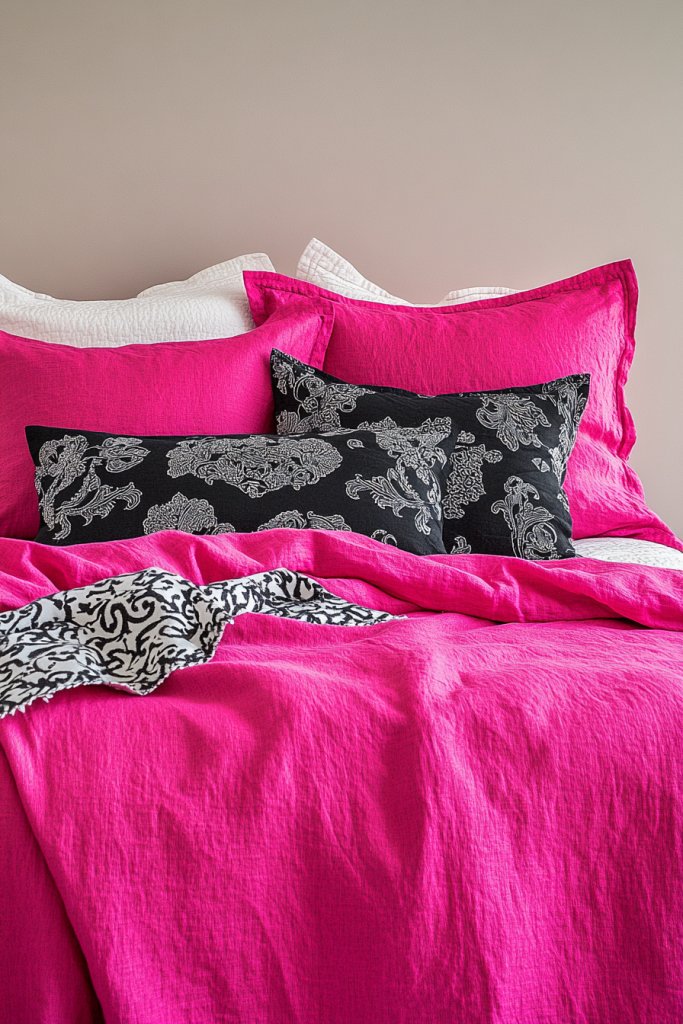 Hot pink bedding with monochrome accents is a bold style move that exudes confidence. It creates an energetic, modern space that’s easy to update over time. When styled thoughtfully, it’s a look that’s both fun and sophisticated, perfect for expressing your personality. Ready to make your bed a statement?