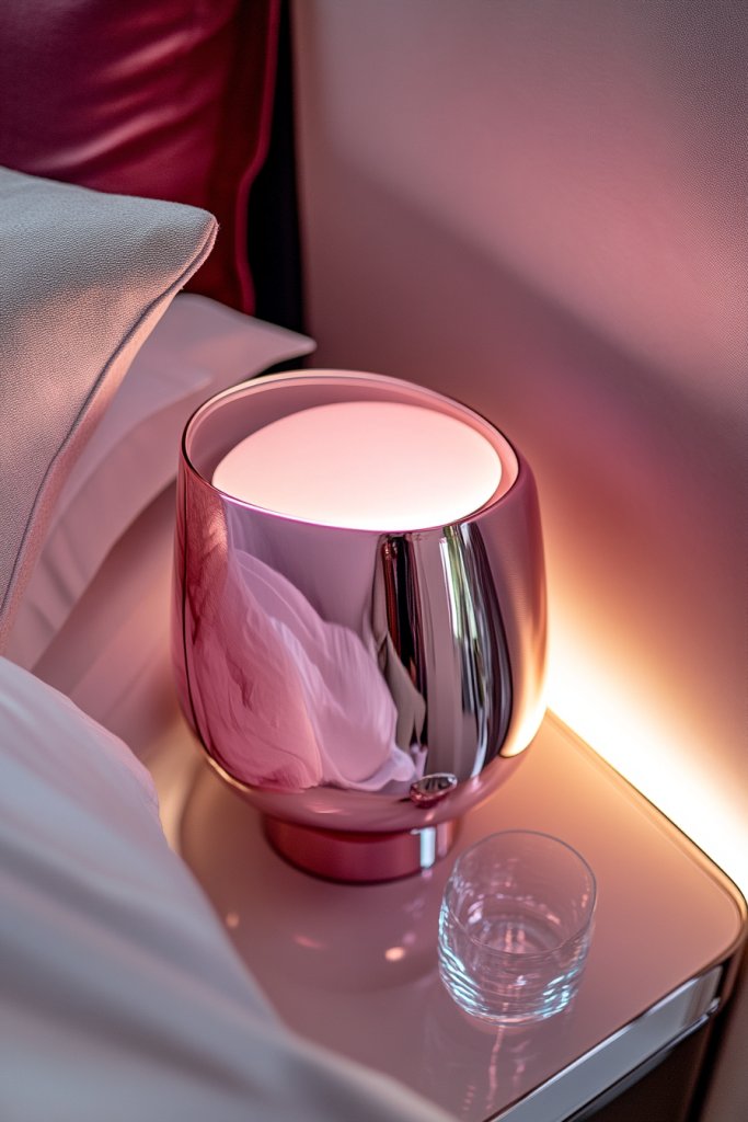 Imagine a sleek nightstand with a shiny pink metallic lamp casting a soft, warm glow. The glossy finish reflects ambient light, creating a shimmering effect that elevates the entire bedside area. The lamp’s modern silhouette complements various decor styles, from contemporary to glam. It’s an eye-catching detail that makes your nightstand a statement piece.