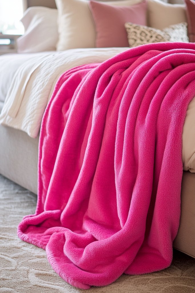 Visualize a soft, plush pink throw casually tossed at the foot of your bed, adding a splash of color and inviting texture. The fabric—fleece, faux fur, or chunky knit—feels inviting and adds depth to your bedding. When layered over neutral sheets or quilts, it creates a balanced, cozy look that’s both stylish and comfy. The vibrant hue energizes the whole space.