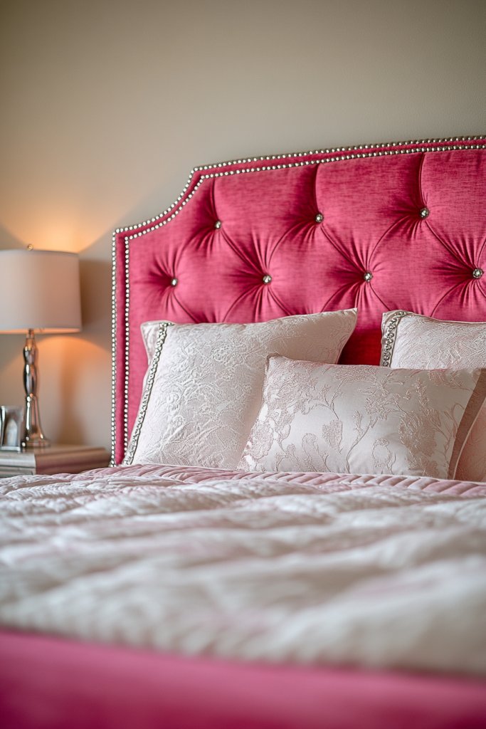 Personalize it with embroidered initials or a subtle pattern in the fabric. Use contrasting colors for the nailhead trim to add visual interest. Pair with matching pink bedding or metallic accents for a cohesive look. For added comfort, layer with extra throw pillows in coordinating fabrics or textures that complement the headboard’s luxe feel.