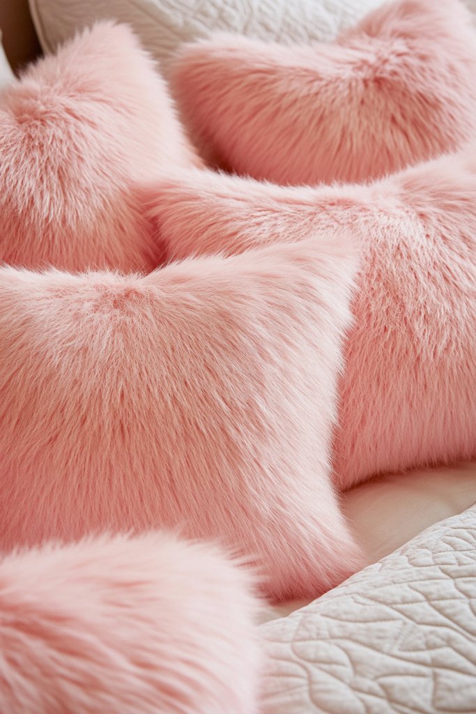 Choose high-quality faux fur in a vibrant pink shade. Use a soft insert to maintain fluffiness and shape. Sew or buy pillow covers with hidden zippers for easy cleaning. Place them strategically on your bed or seating area for maximum impact. They can be washed gently on cold or spot cleaned—check care labels for best results. Combine with other textiles for a cozy layered look.