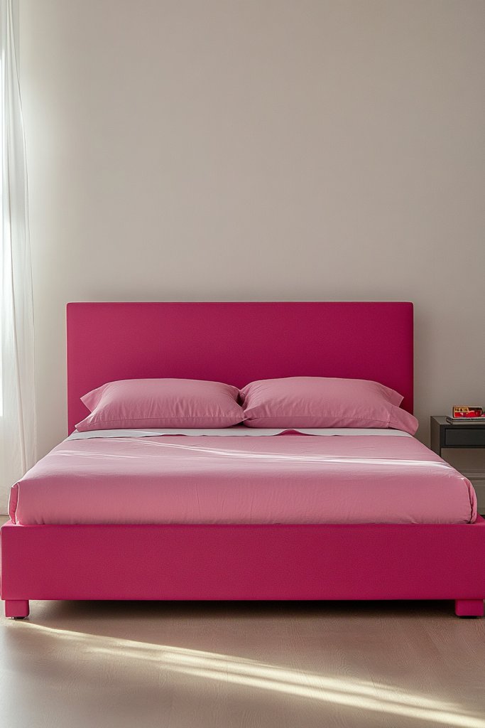 Imagine a streamlined metal or wood bed frame painted in a vibrant, glossy pink. Its clean lines and subtle silhouette keep the look contemporary and uncluttered. The bold color makes the bed an instant statement piece, standing out against neutral walls. The sleek finish reflects light softly, adding a hint of sophistication without overwhelming the space.