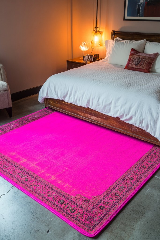 Visualize a plush, oversized hot pink rug peeking out from beneath a bed, adding a splash of color and softness. Its thick pile invites you to walk barefoot and creates a welcoming ambiance. The vibrant hue contrasts beautifully with neutral or muted bedding, making the room pop. It anchors the space, tying together furniture and decor with a cheerful burst of color.