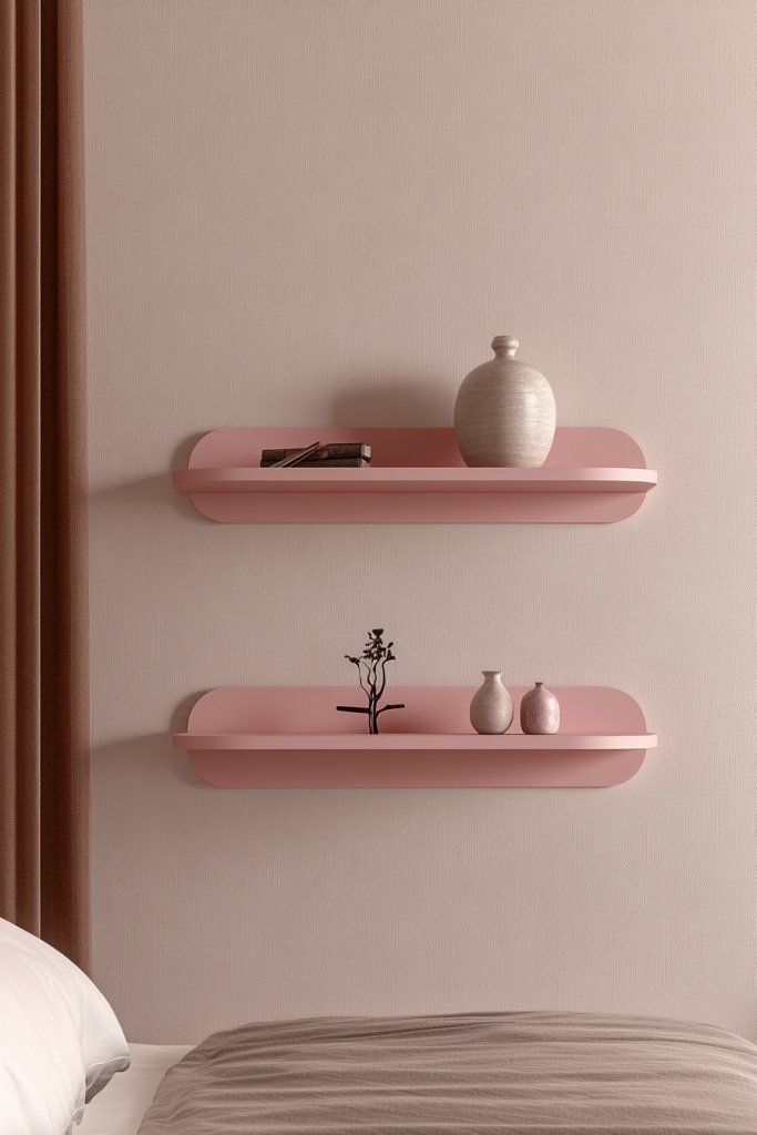 Imagine sleek floating shelves painted in a soft or vibrant pink, mounted neatly on a blank wall. They hold your favorite books, decorative boxes, or small personal items—all within easy reach. The pink hue adds a cheerful, youthful vibe, brightening even the simplest wall. The minimalist design keeps the room feeling airy, while offering ample space for your treasures.