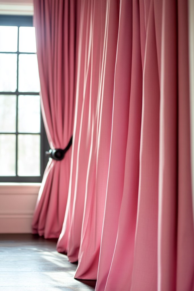 Imagine flowing, vibrant pink curtains made from a luxe fabric like velvet or silk, hanging gracefully from matte black rods. The contrast between the bright pink and dark hardware creates a modern, edgy look. When pulled aside, they reveal glimpses of your room, adding a pop of color to the view. The fabric’s texture adds depth, making your windows a focal point.