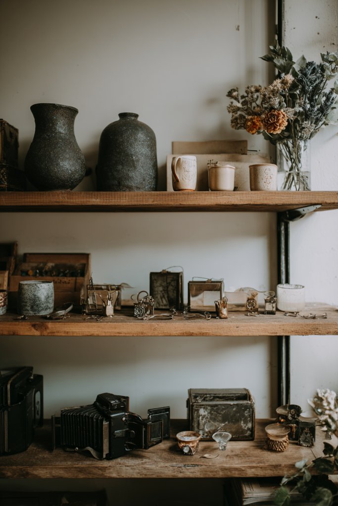 Imagine open shelving or shadow boxes filled with vintage cameras, trinkets, or jewelry. The items are arranged thoughtfully, mixing sizes, shapes, and textures. Some pieces are grouped for impact, others stand alone as focal points. The display feels intentional and nostalgic, inviting viewers to explore each item’s history. Your collection becomes a visual narrative that adds depth and character.