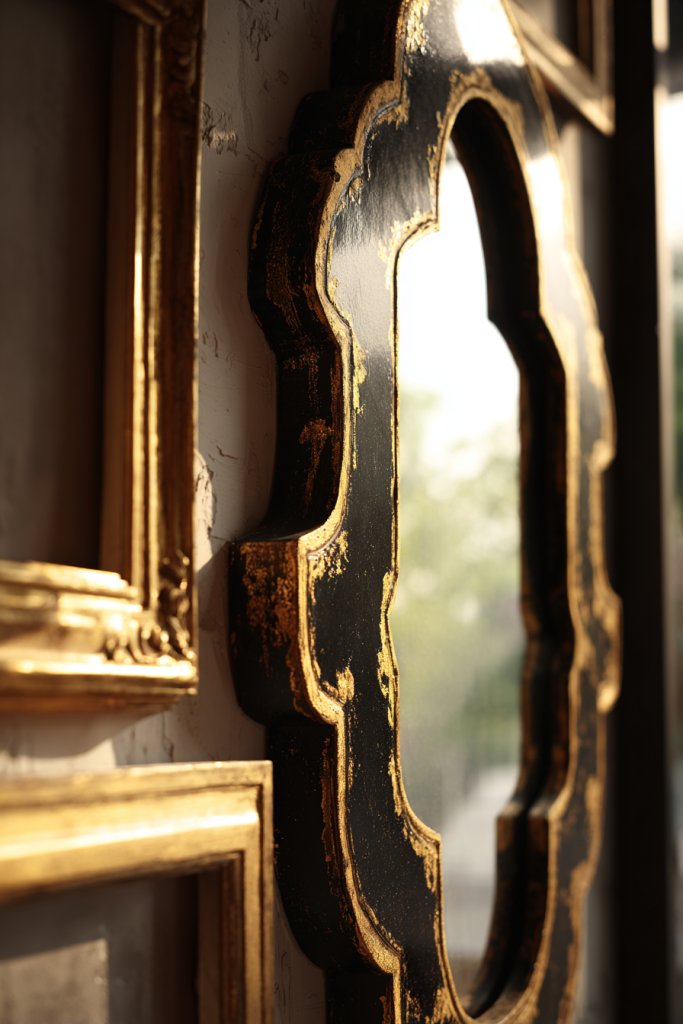 Picture a large, ornate mirror with a distressed, painted frame that looks vintage. Surround it with smaller, uniquely framed mirrors—some with colored borders, others with geometric shapes. The reflections bounce light around your space, making it feel larger and brighter. The eclectic mix of frames adds personality and artistic flair, transforming a simple mirror into a focal point.