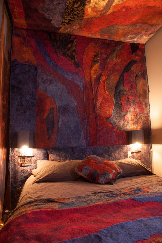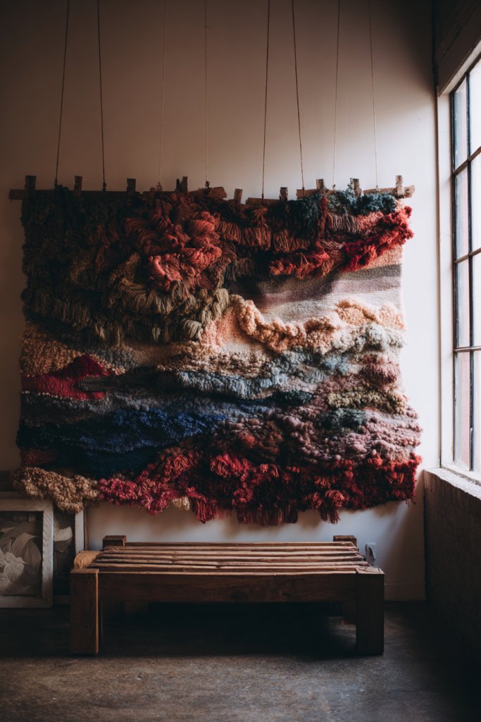 Picture a vibrant, patterned textile draped across a wall, its fringes and embroidery catching the light. The fabric’s rich textures—knits, weaves, or embroidered motifs—bring warmth and depth. Layered over neutral walls, it acts as a focal point that invites touch and adds visual interest. The room feels layered, inviting, and full of personality.