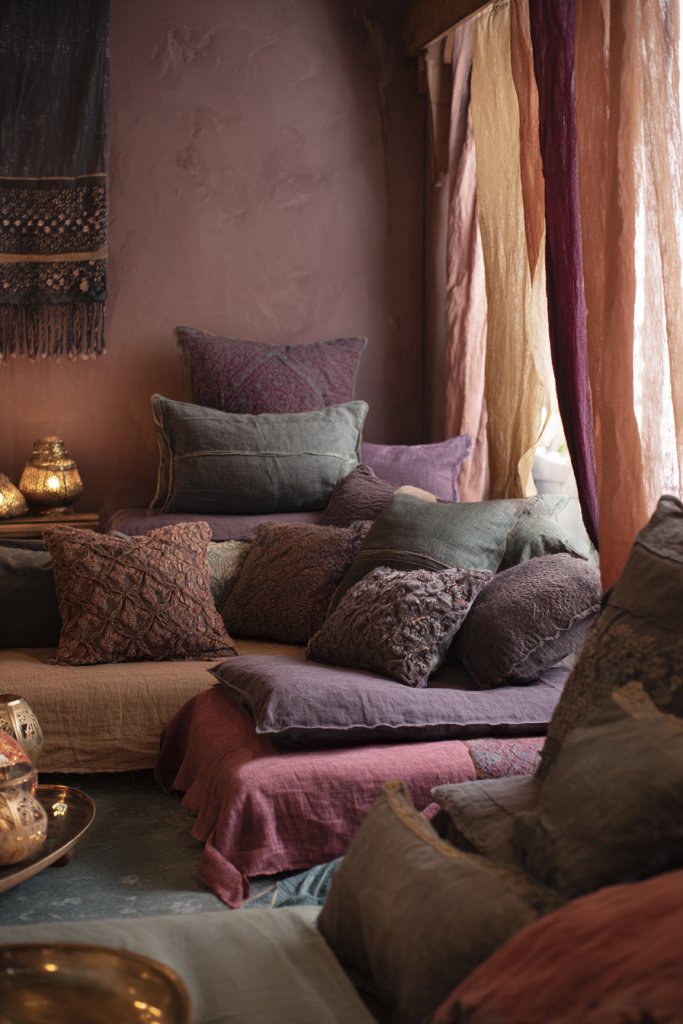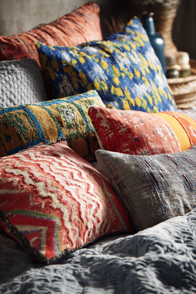 Imagine a bed or sofa adorned with pillows in bold prints, embroidery, or patchwork. Textures range from soft velvets to rough woven fabrics, creating a tactile mix. Patterns might include geometric shapes, florals, or abstract designs—whatever matches your vibe. The pillows invite you to touch and curl up, making your space cozy and inviting.